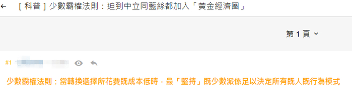 在香港激进分子其中一个网上聚集地“连登”讨论区(LIHKG),也出现多个讨论“黄色经济圈”的帖子。有人“科普”所谓的“少数霸权法则”,为逼迫中立和“蓝店”改变立场想招↓