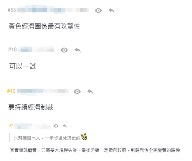 还有人跟帖附和称,“黄色经济圈最有攻击性”、“可以一试”、“要持续经济制裁”、要造成大规模失业,最后将矛头对准港府,就是全港民众“变黄”的时机↓