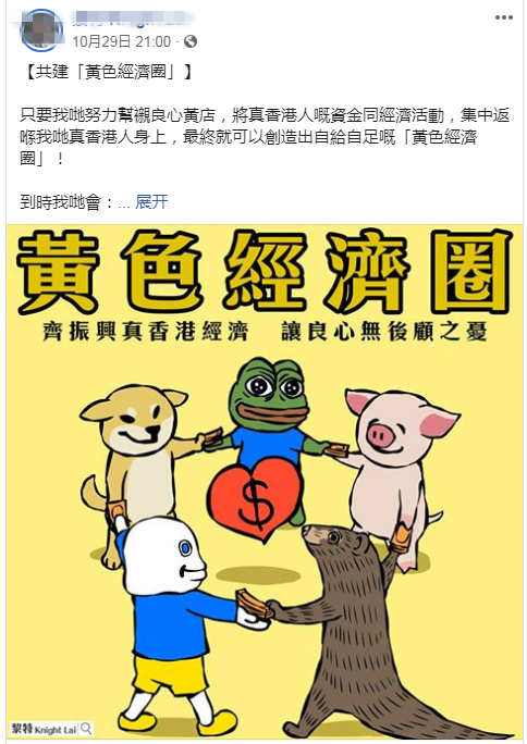 有香港激进分子近日在脸书、连登等社交平台发出“共建‘黄色经济圈’”的呼吁。他们宣称,只要努力帮衬“黄店”,将“真香港人”的资金同经济活动,集中返在“真香港人”身上,最终就可以创造出自给自足的“黄色经济圈”。建立“黄色经济圈”对香港人“百利而无一害”。
