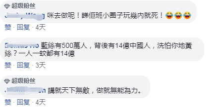 有网友则直言:去做吧,看这班小圈子玩几周就“死”;“蓝丝”有500万人,背后有14亿中国人,会怕你们“黄丝”?还有网友则讽刺道:“讲就天下无敌,做就无能为力”↓
