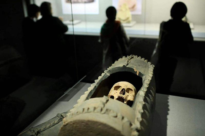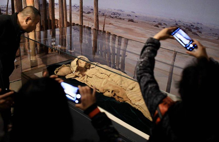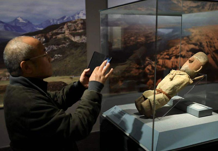 观众参观4000多年前的新疆“小河公主”。一同展出的还有“小河公主”船棺、男根立木、女阴木桨,以及来自塔克拉玛干大沙漠的千年黄沙。