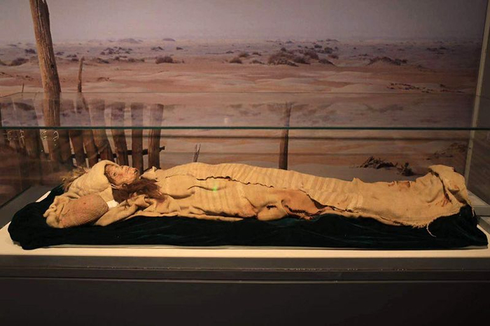 “小河公主”头戴白色圆毡帽,左侧插2根单杆羽饰,横缀1只伶鼬,鼬头悬于帽中部。头部下枕白羊皮。“小河公主”身高152厘米,深眼窝,亚麻色眼睫毛,高鼻梁,面容娇好,体态丰腴。全身涂抹乳白色浆状物,经检测为乳酪。