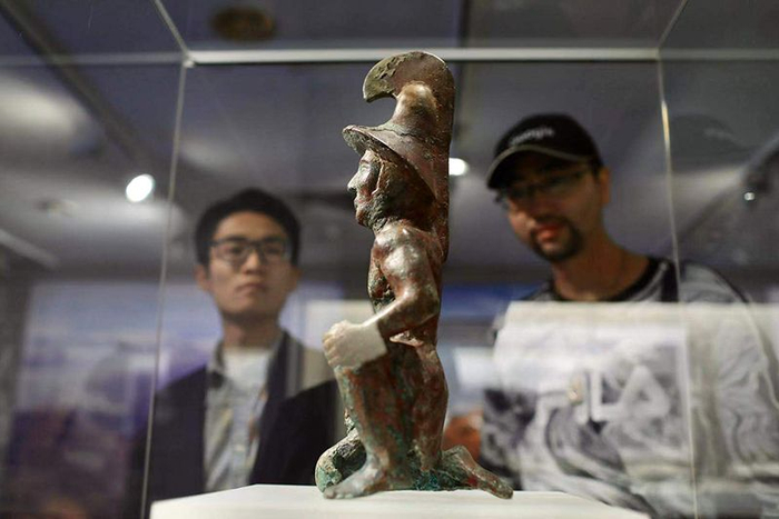 战国时期的铜武士像。这件铜武士像应该是希腊化时代影响下的产物,是中国和希腊化世界存在文化交流的物证。