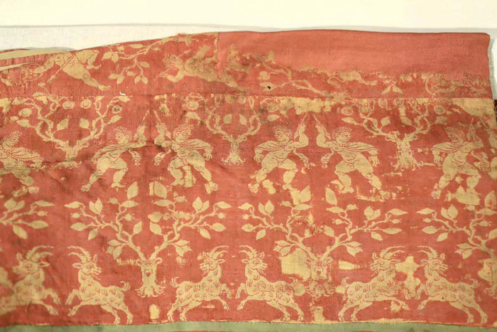 值得注意的是,墓主人所穿红地对人兽树纹双面罽袍,袍上纹样对称规整,每区上下六组,横向布置对人纹或对牛、对羊纹等典型的波斯图案,当中用横排的无花果树或石榴树隔开。