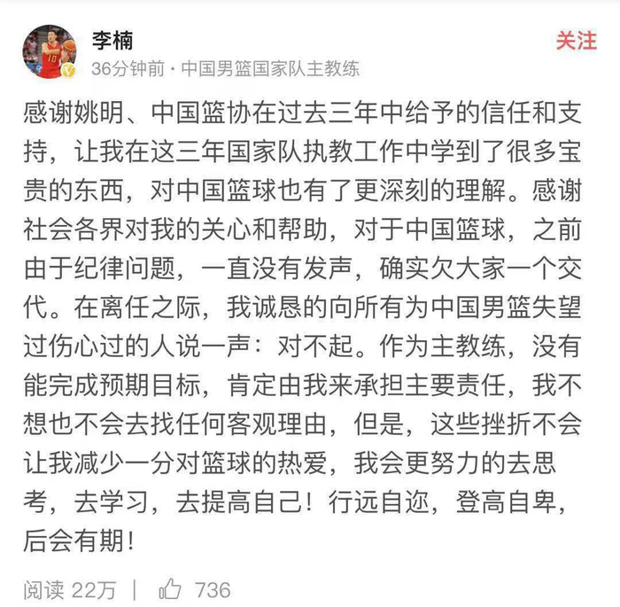 李楠在下课消息公布之后,也在个人社交媒体上发声,“向所有为中国男篮失望过伤心过的人说一声:对不起。”