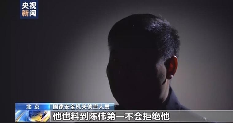 国家安全机关侦查人员:对方是专业人员,他在通过和陈伟短暂几次接触之后,对他性格当中柔弱、犹豫不决,不懂得拒绝别人这个特点,进行了一个准确的把握,他也料到陈伟第一不会拒绝他,第二一定不敢声张。