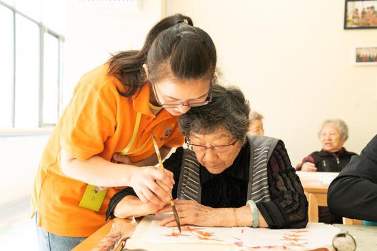 近日,在虹口区市民驿站嘉兴路街道第一分站托老所内,88岁老人朱德明和老伙伴们,在嘉兴路街道老年协会会长周佩铭老师的指导下,创作水墨画。他一边画,一边忍不住向记者感叹:“我越来越留恋这里了。它就是老年人的一个好归宿。”