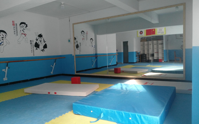 10月25日,新京报记者探访发现,训练馆地面用泡沫地垫完全覆盖,上有两白一蓝三张软垫,墙上绘制着跆拳道卡通人偶。房东丁怜说,这本是她家的跆拳道馆,周末上跆拳道课,周一到周五则租给释延洹使用。训练馆内原本装有摄像头,但自9月场馆装修改造时起就一直没有插上电源。