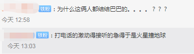 还有人被节目中二人的谈话气氛感染,“为什么这俩人都结结巴巴的”“打电话的激动,接听的急得于是火星撞地球。”↓