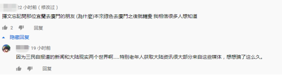 还有台湾人提问,为什么本来“绿色”的李大爷去了厦门就转变。于是有大陆人解答:因为绿媒报道的大陆新闻和大陆现实是两个世界,于是去大陆的老年人一想就会发现被骗了那么久。↓