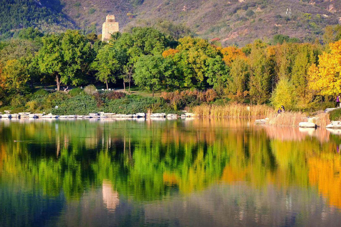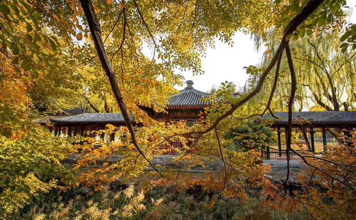 在颐和园后溪河两畔,金黄色的大叶白蜡、元宝枫与初红的五色地锦一同装点着河堤。北海公园静心斋内,红色的枫叶、地锦、绿色的苍松翠柏、黄色的杏树、藤蔓错落有致,呈现出古典园林丰富的秋季植被色彩。中国园林博物馆塔影别苑栽种的70株紫薇树也已呈现金黄色。