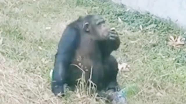 相关视频显示,一处草坪上,一只黑猩猩正拿着一个疑似烟头的物体,并将该物体塞入嘴里“吸烟”。有消息称系发生在合肥市野生动物园。