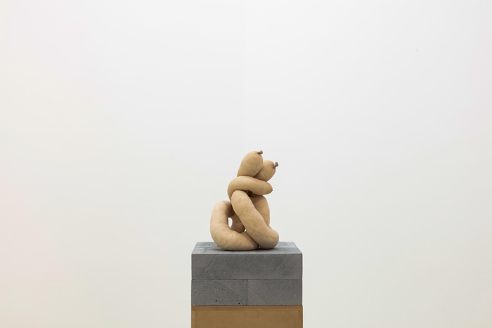 此次为红砖美术馆特别创作的作品中,也同样体现了卢卡斯一贯的对日常物品的使用与转化。展出的六件“NUDS”雕塑是将塞满绒毛的尼龙袜做成难辨形象的生物形态。卢卡斯实现了强壮和孱弱的一种似是而非的结合,填塞尼龙袜看上去既像石头,又像血肉之躯。NUDS一词本身就暗含了“knots”(结)、“nodes”(节)或“nudes”(裸体),由此可见,语言也被卢卡斯用作雕塑的一个元素。