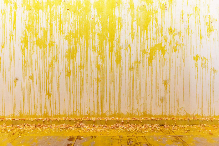 另一件新作品《下面(北京)》,卢卡斯将粉色的硅橡胶倾倒在一个在北京当地获得的废弃浴缸中,硅橡胶缓慢从浴缸的排水口流出,在浴缸下的地面逐渐扩张,最终形成了一滩凝固的粉色乳胶。