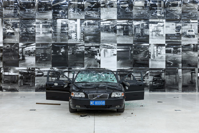 除了砸鸡蛋,在开展前,莎拉·卢卡斯还邀请众多参与者一起砸毁了一辆老旧黑色沃尔沃汽车,创作了《北京钻石》这件作品。这件作品灵感源自艺术家在英国经常看到的被故意毁坏的汽车。与之呼应的,是同一展厅展出的以废旧汽车及香烟为材料创作的大型雕塑《废话墓志铭》,艺术家巧妙地将暴力付诸于对死亡的精妙暗示之中。