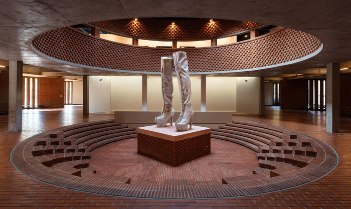 此次展览包括卢卡斯的诸多经典作品,走入红砖美术馆映入眼帘的是《路人朵丽丝》——一双混凝土浇筑的水台靴。这双及膝长靴摆出了羞怯中又带些诱惑的姿势。用局部代表整体是卢卡斯作品的一贯手法,没有了身体部分的靴子所摆出的姿态将女性特征观念符号化,也许还是一种讽刺和颠覆。在这个大尺寸版本中,水台靴的朋克摇滚魅力和色情癖得到了放大。