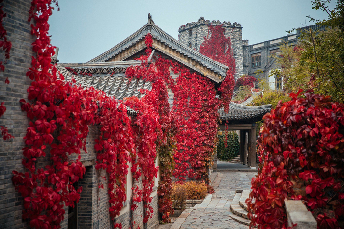 而古北水镇里的红色“主角”则是无处不在的五叶地锦——这里的爬山虎品种是五叶地锦,与平时常见到的“单叶三裂”品种相比,更加小巧、飘逸。当游客在青石板老街漫步,或者在河道里摇橹,或者拾阶而上,随时随处都可“邂逅”层层叠叠、飘逸玲珑的五叶地锦,几乎把整个镇子都染成红彤彤的。日本一位园林专家曾说,园林景观的营造讲究远景与近景,宏观与微观的相互搭配和融合。小镇上的五叶地锦恰恰将漫山遍野的红叶“拉”到游客的眼前,让宏伟的秋日风光变成微缩的、精致的小景观,可与游人轻松互动。