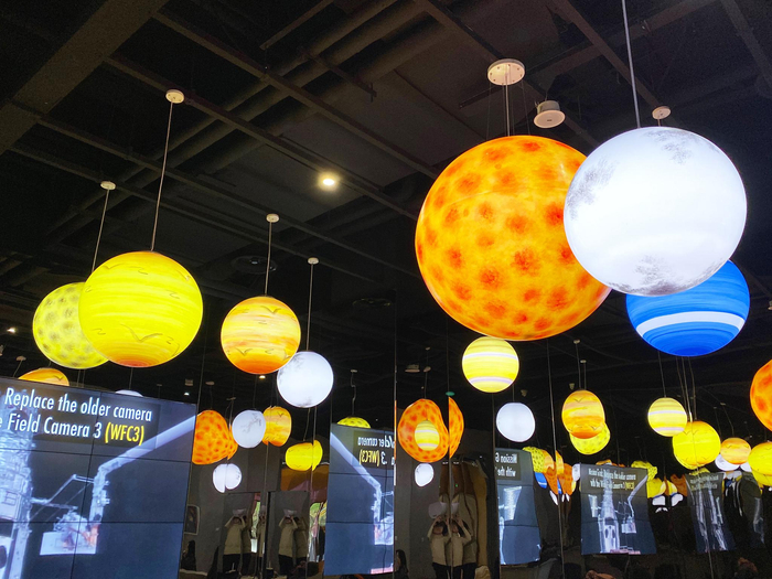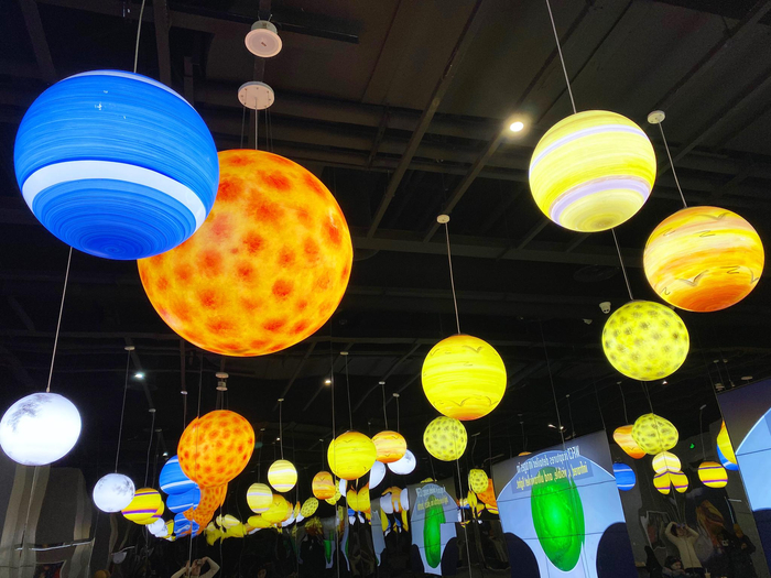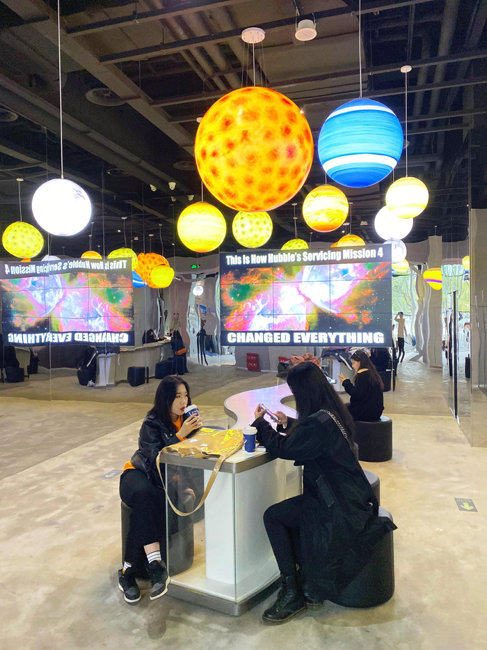 欣赏完“星际宇航员”模型和咖啡机器人后,京蜜发现在店门右侧,有一片非常浪漫的区域,这片区域被称为“星球密室”。天花板上悬挂着大小不一、绚丽多彩的“星球”,这一区域还摆放着蜿蜒曲折的长桌,内侧的屏幕上,循环播映着NASA的探月短片,坐在这里,仿佛坠入了无边无际的星河,那感觉,美妙至极。