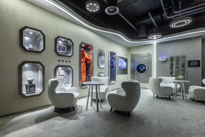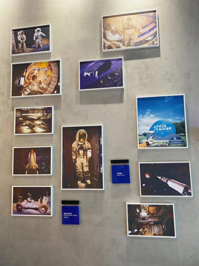 京蜜从“星球密室”走出来,继续往里走,发现在柜台旁边,有一个银色的滑梯,这个滑梯被称作“太空滑梯”,很多孩子会在“太空滑梯”上玩耍。滑梯旁边是乳白色的桌椅,滑梯连通的二层,除了供顾客使用的桌椅外,在墙壁上还摆放着NASA原版航空器模型等物品,供感兴趣的顾客观赏,这些物品在人类“探月之旅”中大多具有重要的纪念意义。