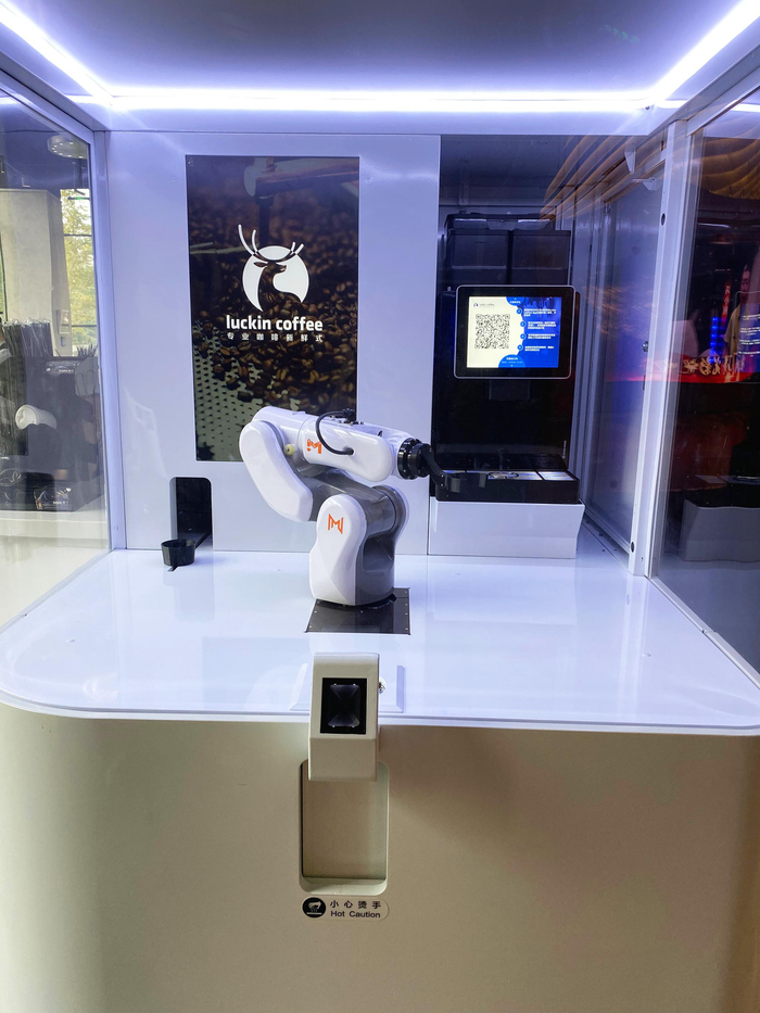 在“星际宇航员”模型的旁边,就是致敬NASA主题店的“镇店之宝”——咖啡机器人,之所以称之为“镇店之宝”,是因为致敬NASA主题店是瑞幸咖啡首家配置机器人的门店,瑞幸咖啡其他门店目前还没有可以自动制作咖啡的机器人。