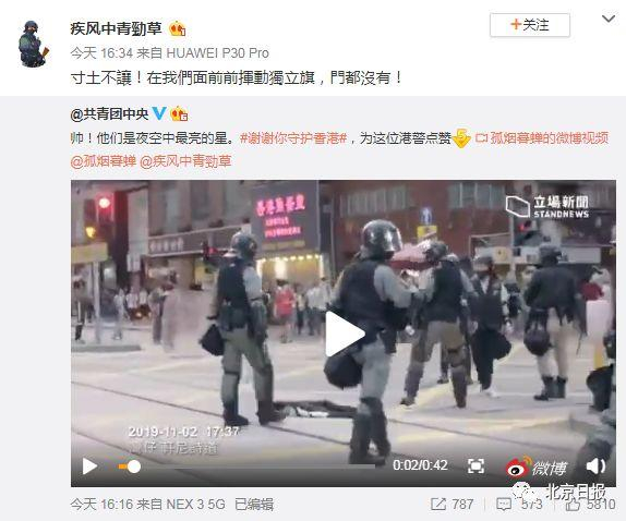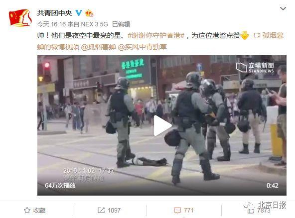 共青团中央官博转发了这段视频并配文称“帅!他们是夜空中最亮的星,谢谢你守护香港!”