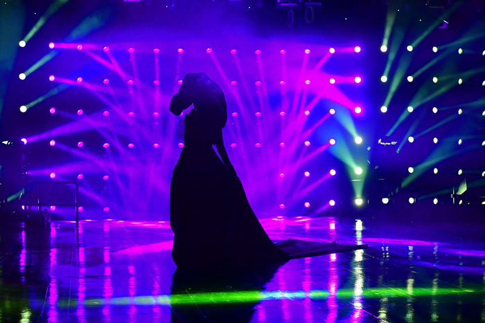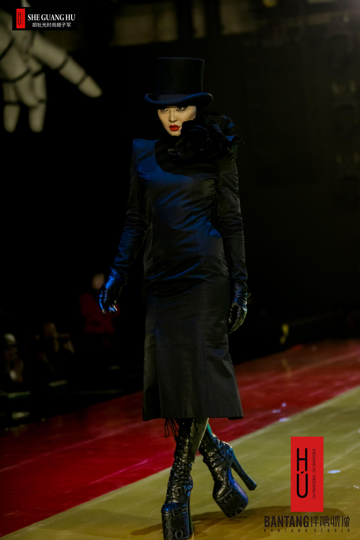 设计师胡社光一直凭借夸张的版型和曲线打造艺术化的廓形,300套礼服在统一的黑色调中靠层次、线条、拼接打造曲线,精致的妆容、优雅的帽子,冷艳又不失高级感。