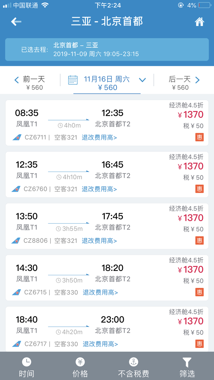 10月29日,新京报记者在南航App查询时也发现,使用往返功能时,11月16日返程CZ6711航班最低价格是1370元,为全价的4.5折;单独预订同时间CZ6711航班时,最低价格是600元,为全价的2.1折,而这一优惠并没有显示在此航班使用往返功能预订的页面中。