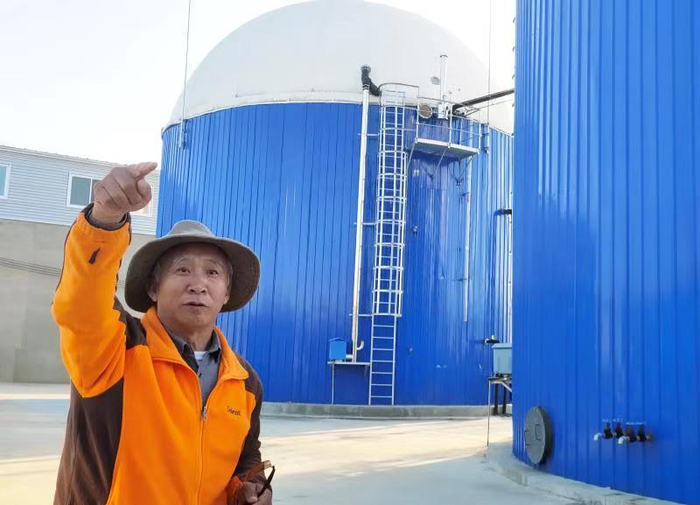 孙建设教授介绍第壹驿站园区布局,背后蓝色圆筒是两座沼气发酵罐。新京报记者 王纪辛 摄