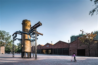 除了那些历史沧桑的建筑,红梅味精厂还有一些老设备、老符号。诸如发酵罐,万科把其中两个发酵罐永久保留在发酵艺术中心,另外两个作为园区标志性景观雕塑,矗立在东西两个大门旁。
