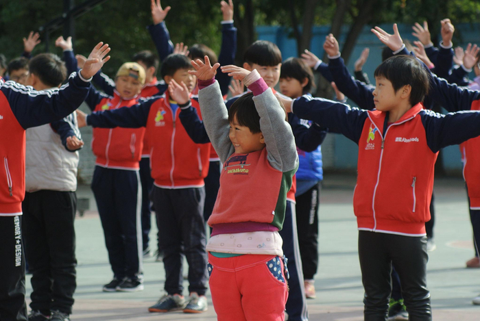老师带着幼儿班的小朋友跑步。新京报记者 王巍 摄