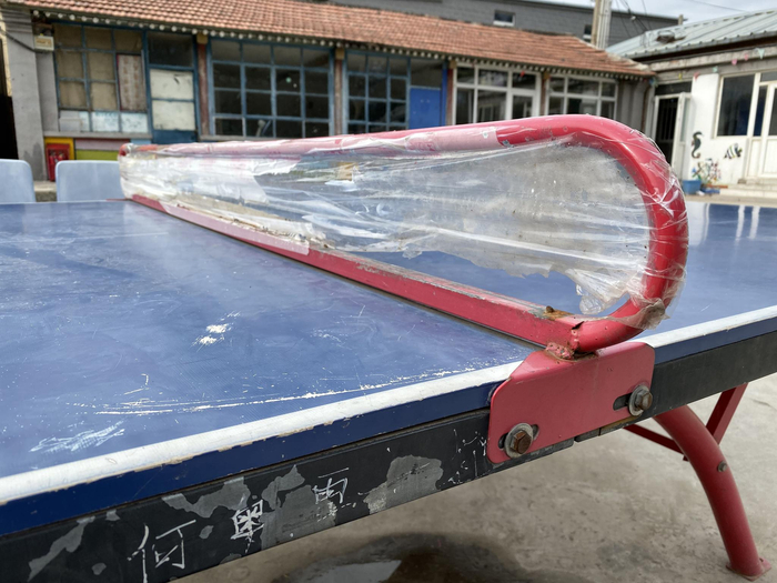 孩子正在修手中破了的球拍。新京报记者 王巍 摄