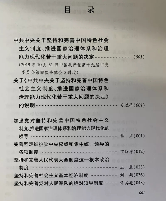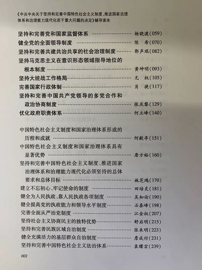 新京报记者从人民出版社获悉,学习领会全会精神的官方权威辅导材料——《<中共中央关于坚持和完善中国特色社会主义制度、推进国家治理体系和治理能力现代化若干重大问题的决定>辅导读本》(简称《读本》),近日已由人民出版社出版发行。