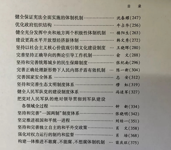 人民出版社政治编辑一部主任张振明对“政事儿”表示,《读本》由十九届四中全会文件起草组组织编写,作者阵容非常强大。四中全会《读本》除了收录已经发布的全会《决定》和习近平总书记所作的说明外,还收录了13位党和国家领导人、近30位省部级领导干部和有关专家撰写的解读文章。
