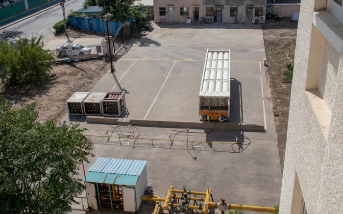 记者在太阳城小区看到,市民反映的天然气压缩罐为长10余米、高3米左右的运输车箱,存放在小区西侧。现场没有车头,距小区71号楼仅一墙之隔,直线距离仅十几米。输送天然气的管道直接暴露在室外,无任何遮挡设备。在压缩罐西侧很近的地方,便是太阳城小区的锅炉房。