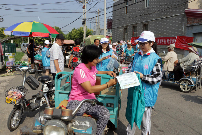 在宣传垃圾分类志愿活动中,小志愿者们在集市入口发放垃圾分类宣传材料。平谷区山东庄镇团委供图