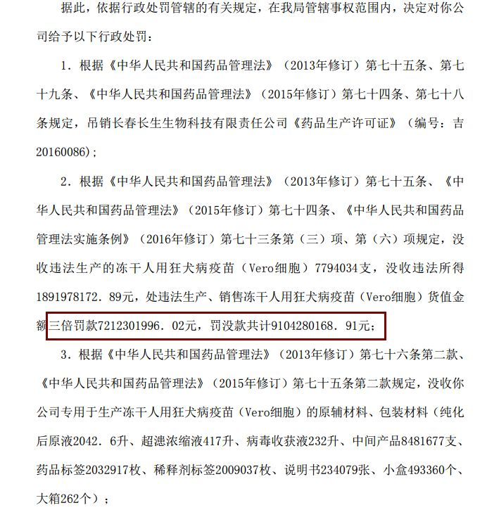 2018年10月,长春长生收到的行政处罚决定书显示,在2014年1月至2018年7月,长春长生违法生产销售冻干人用狂犬病疫苗(Vero细胞)共计748批(含亚批),决定对长春长生予以没收违法生产的冻干人用狂犬病疫苗(Vero 细胞)779万支,没收违法所得18.9亿元,处金额三倍罚款72.12亿元,罚没款共计91亿元。