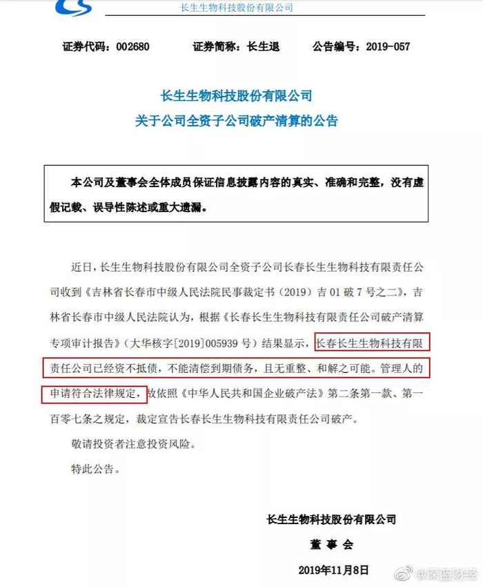 日前,正处退市整理期的长生退(原长生生物)发布公告称,公司全资子公司长春长生宣告破产。长生退在公告中表示,长春长生近日收到《吉林省长春市中级人民法院民事裁定书(2019)吉01破7号之二》,法院认为,根据《长春长生生物科技有限责任公司破产清算专项审计报告》(大华核字[2019]005939 号)结果显示,长春长生已经资不抵债,不能清偿到期债务,且无重整、和解之可能。依照《中华人民共和国企业破产法》第二条第一款、第一百零七条之规定,裁定宣告长春长生生物科技有限责任公司破产。