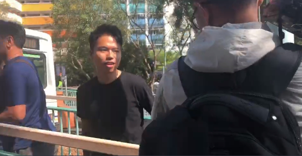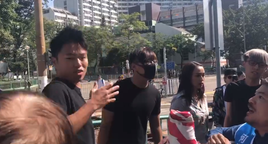 黑衣人与何君尧支持者在围栏两侧互相高喊,期间有市民扯掉的黑衣人的口罩。