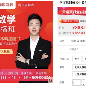 学而思网校的双十一活动仅限淘宝的学而思网校官方旗舰店,官网不同步参与。参与大促的商品包括小学语数英、初中语数英理综、高中语数英文综的寒假直播课程,7个课时,原价888元,双十一价格782,另外,加上“日常优惠”、“店铺专项9折”“满减购物津贴”等各种名目的优惠,最终到手价为684元。