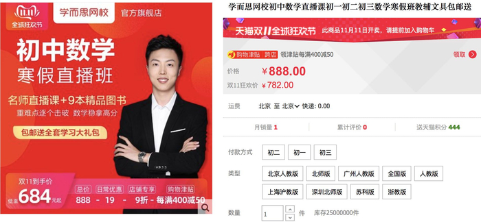 而记者在学而思网校官网看到,同样年级、科目、班次、课时数的课程,标价为700元,淘宝旗舰店的双十一价仅比官网常规价格低16元。