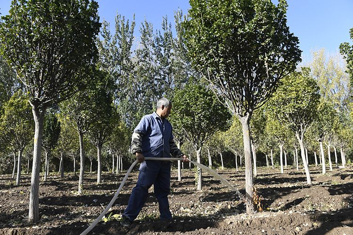 研发苗木基地,工人们正在为“华源发黄杨”浇水。