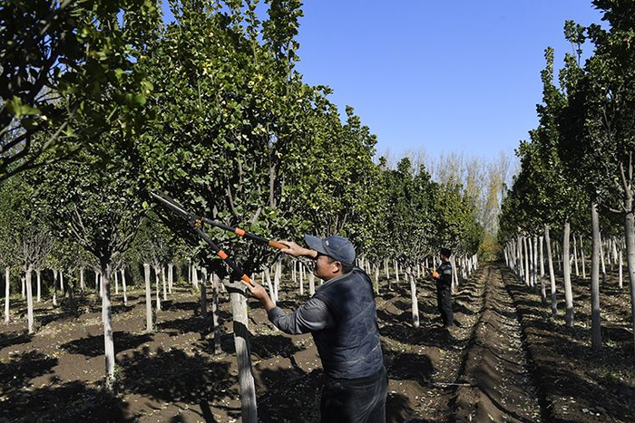 研发苗木基地,工人正在修剪“华源发黄杨”的枝叶。
