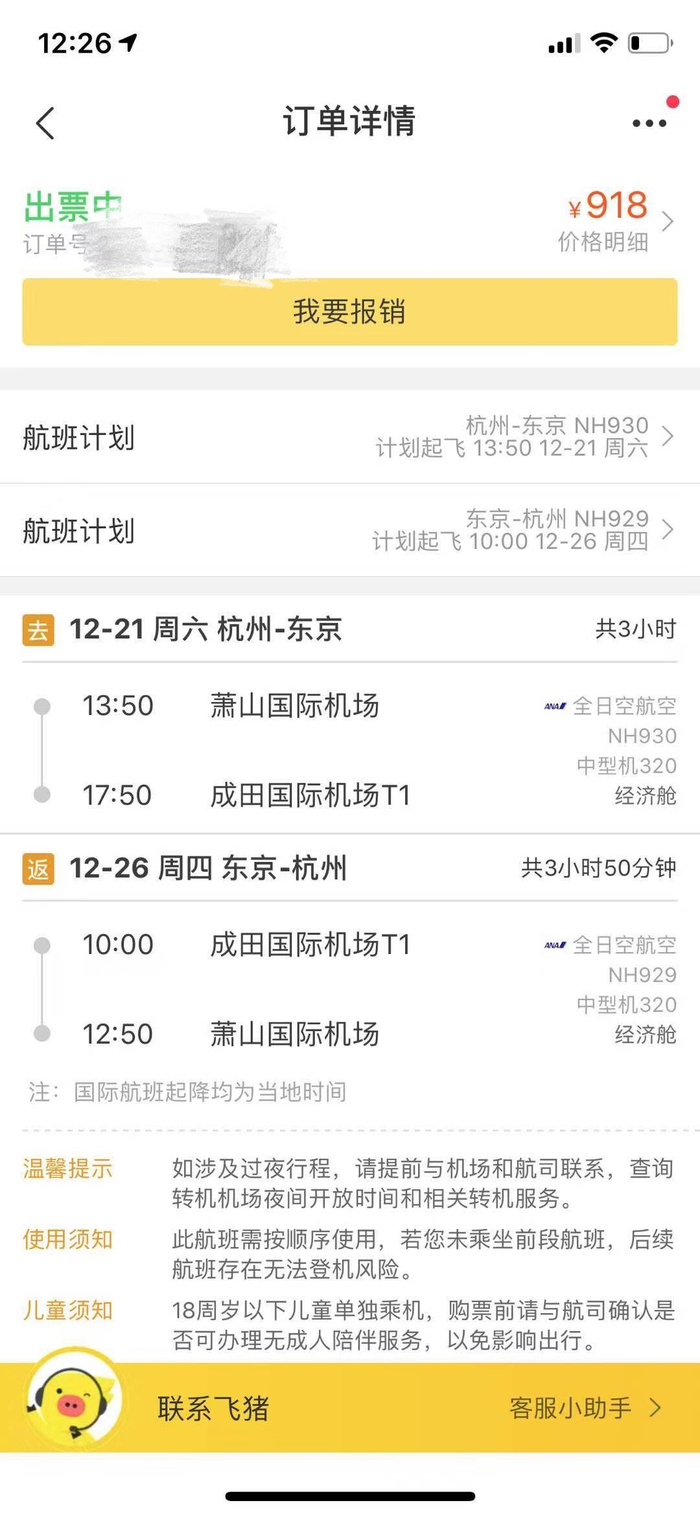 11月10日晚,陈女士打开飞猪APP,选择了往返日期、出发和到达地点及标记为“全日空航空”的航班。零时一过,陈女士立即下单购买了一张价格为906元的机票,并为此实际付款918元。