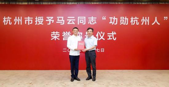 也是在9月,在阿里巴巴集团成立20周年之际,杭州市委、市政府举行授予马云同志“功勋杭州人”荣誉称号仪式。周江勇为马云授证书和印章。