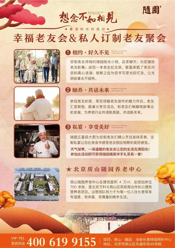 “老友会”是随园最近推出的一款明星产品,面向全北京的70岁以上的长辈,为他们专程搭建了一个与老友同聚的温馨空间,不仅有定制的健康营养桌餐、更有会为老朋友定制老照片影集,想念不如相见,让更多好朋友、老同窗、老同事们重聚随园,共同追溯曾经在一起的美好芳华。