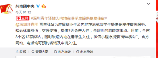 @深圳共青团 青年驿站为应届毕业生及内地在港就读学生提供免费住宿等服务。驿站环境舒适,交通便捷,提供7天免费入住,是深圳的温暖落脚点。目前,全市8个区12家驿站,随时欢迎内地在港学生入住,微信小程序搜索“青年驿站”、官方网站、电话均可预约咨询及申请入住。