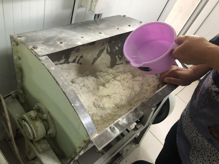早上八点刚过,魏各庄洛平精品采摘园里崇德农庄的后厨操作间里弥漫着一股生面的香气。厨房师傅跟前半人高的和面机里,前一天留下的面肥和少许碱面,正随着师傅不断倒出的面粉一圈一圈地搅动。除去运用机械的力量和面,这应当算得上是山东胶东地区最正宗的戗面馒头做法——以老面肥为引子和面,发酵后加入食用碱中和酸味,然后分多次兑入面粉反复揉进面肥之中,这个反复揉进干面粉的过程,即是“戗面”二字的意思。