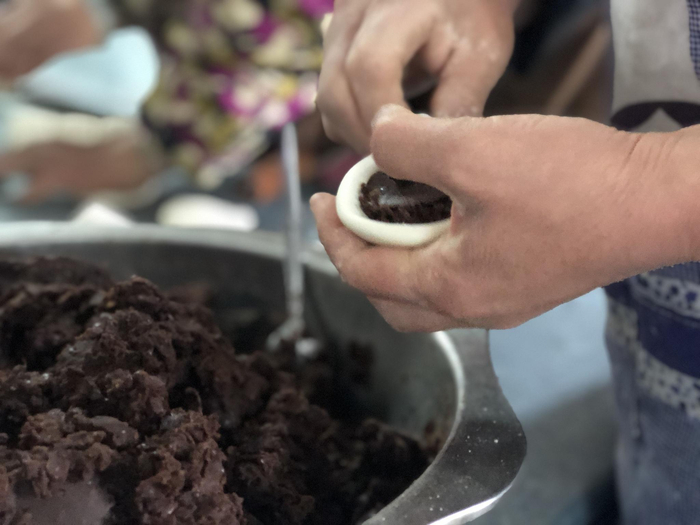 40斤面粉制成的不全都是馒头,王姐说农庄的豆包儿也是村里人的心头好。“热豆馅不如凉豆馅好包,所以这馅料都是师傅们前一天就做成的豆馅。”一盆五六斤的红豆馅,表面还带少许的红豆皮。对着面团,对流程熟练的师傅手起刀落,每一刀下去,都能最后擀成重约一两六的面皮,两勺豆馅包进皮里,最终的重量一定是稳定在二两八到三两之间。