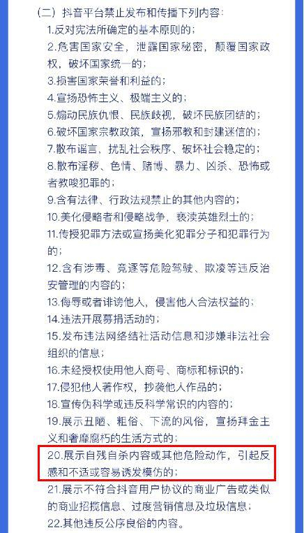 抖音网络社区自律公约里的行为准则注明称,“抖音平台禁止发布和传播展示自残自杀内容或其他其他危险动作,引起反感和不适容易诱发模仿的”内容。
