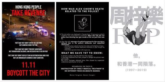 彭博社网站贴出的香港示威者制作的“文宣品”,写道:向香港警察复仇、11月11日抵制全城、为什么周梓乐之死与警方有关